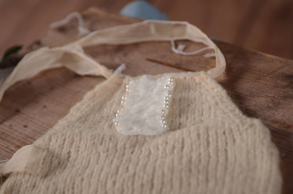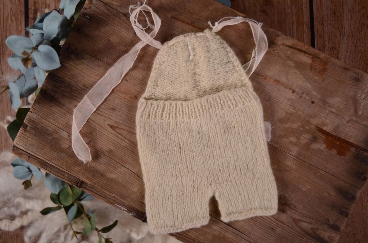 Short dungaree knitted with soft angora threads and decorated with small pearls and beige crochet details on the front. This product is ideal for all kinds of photo sessions with newborn babies; perfect for all kinds of sessions and in all the scenarios you can imagine, both on the bean bag or for placing babies on stands or bowls.