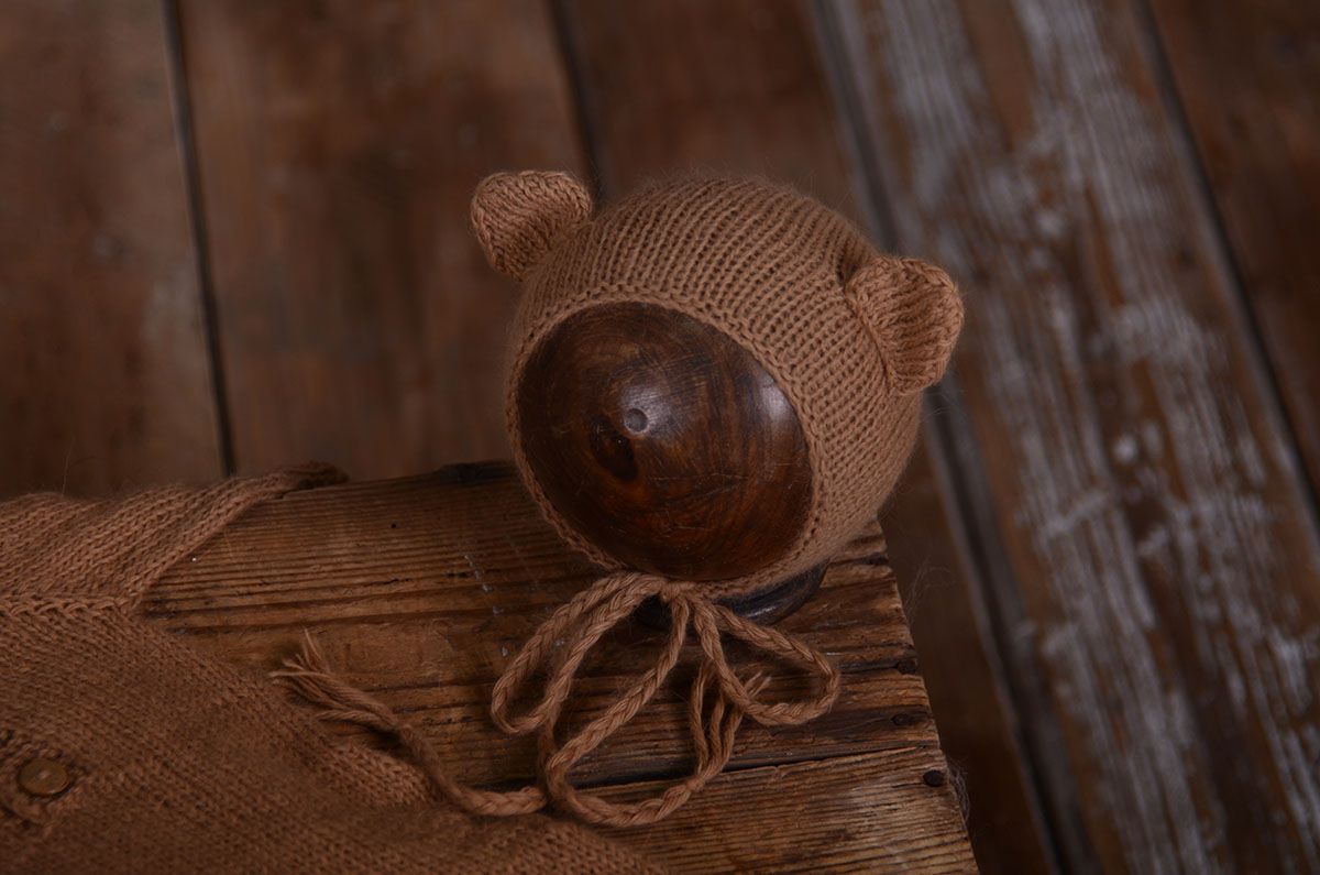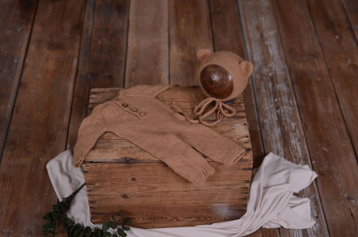 Long-sleeved mohair pyjama set with matching hat, knitted with soft mohair yarns in the same colour. Due to its size, this product is ideal for newborn photo shoots, both on a bean puff and in those where stands are used.