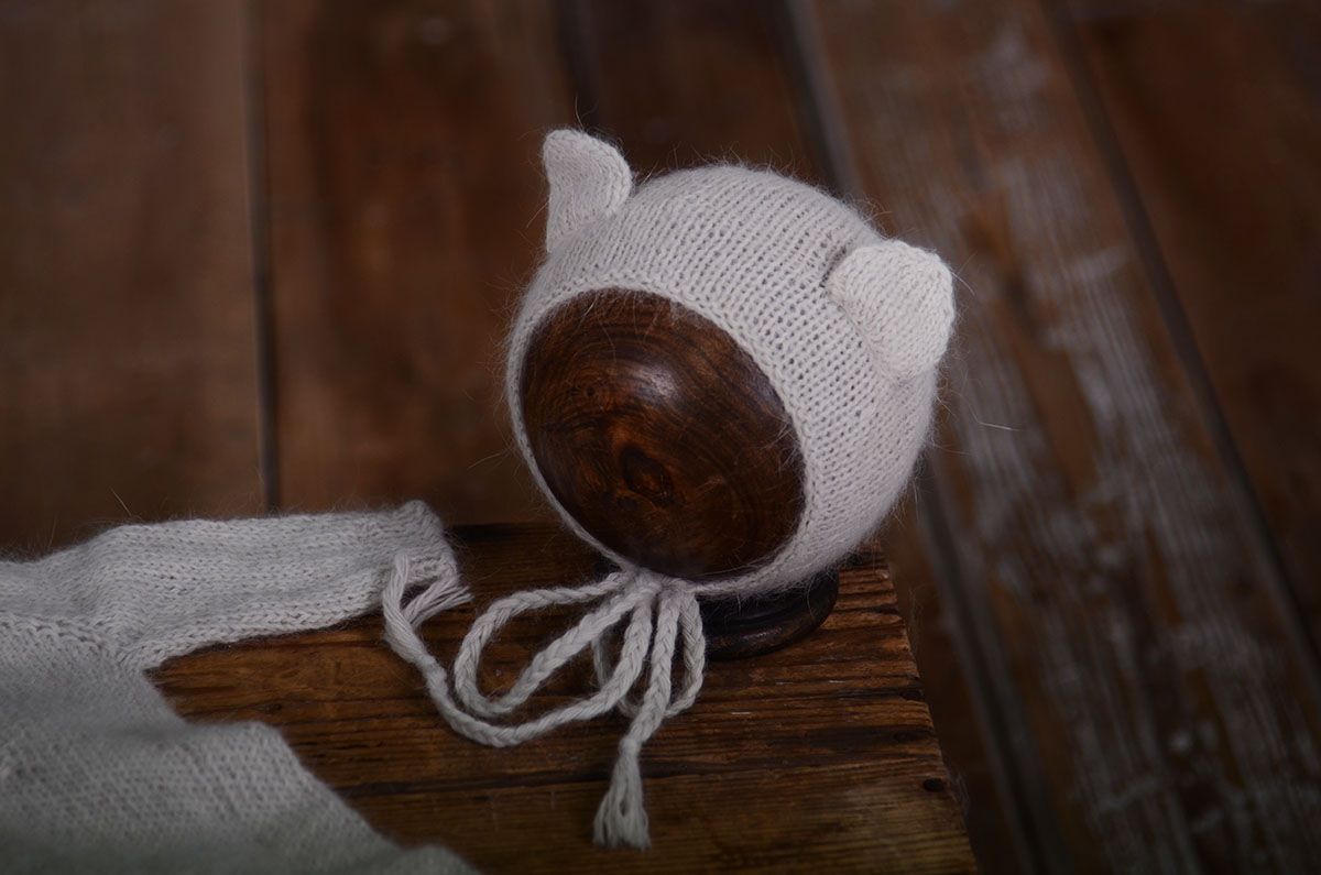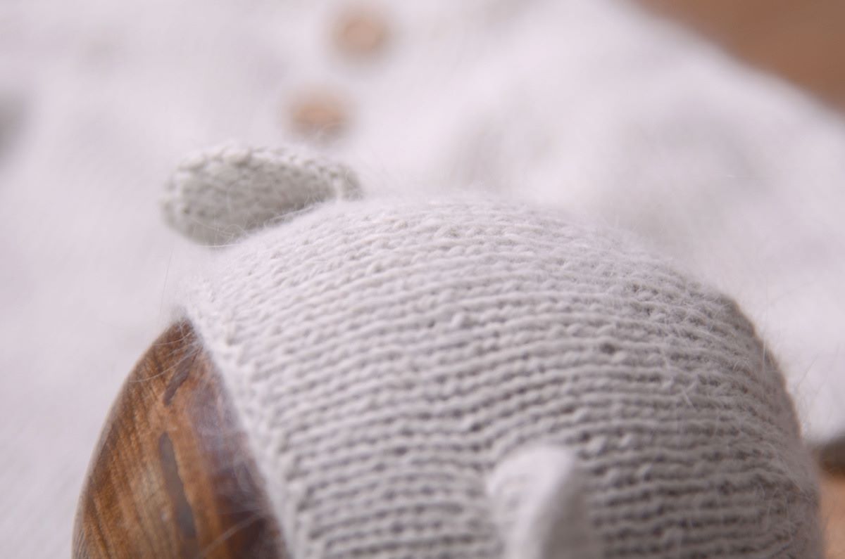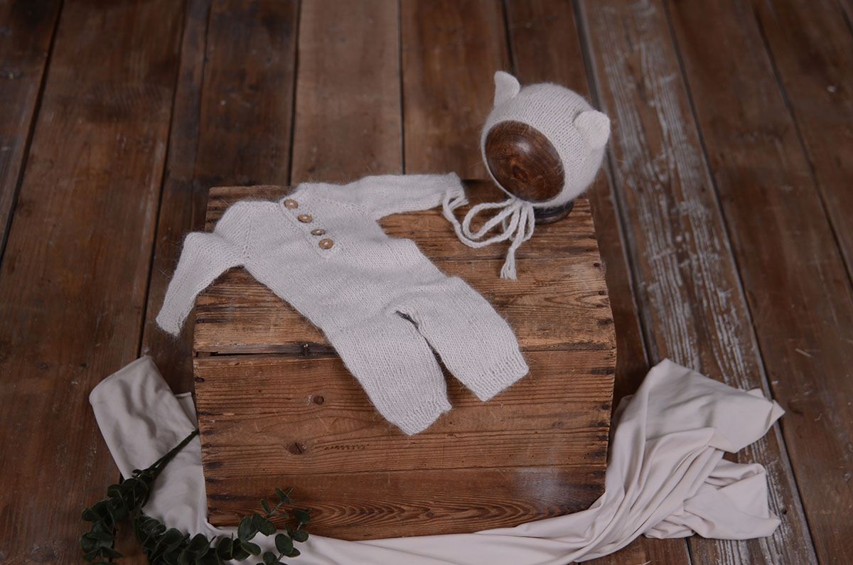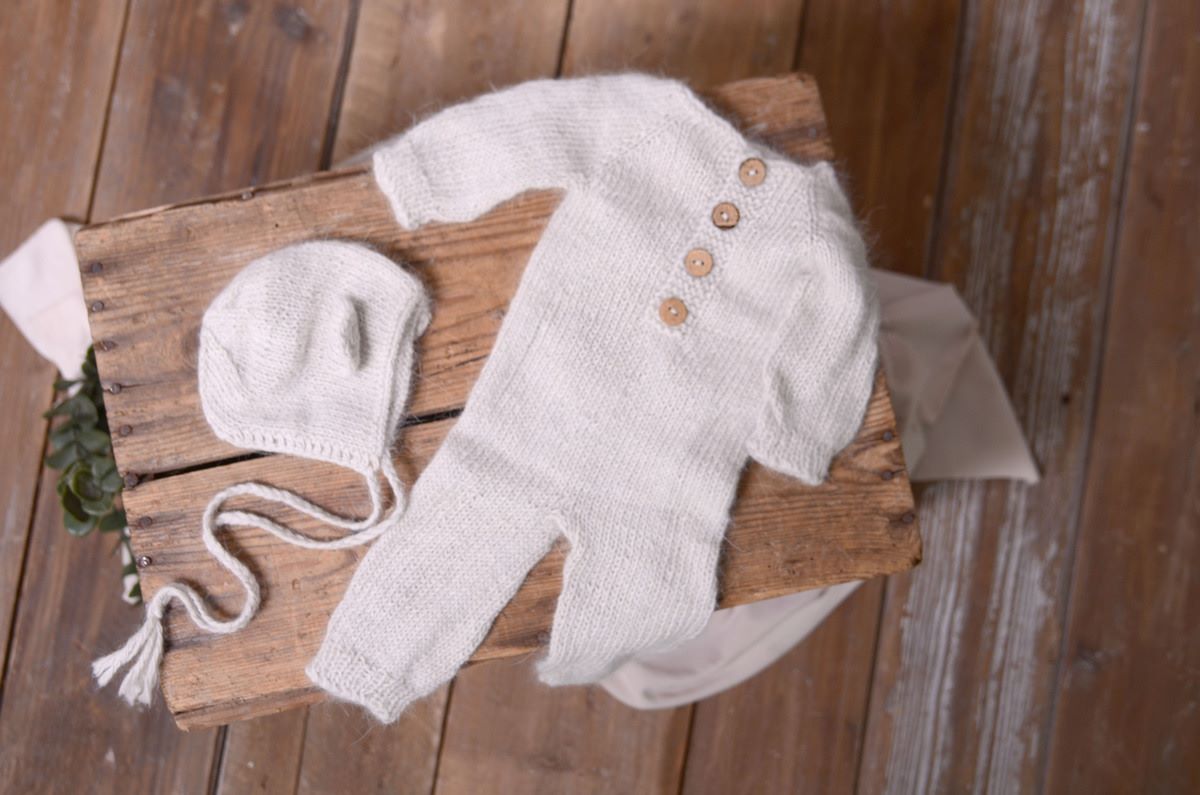 Long-sleeved mohair pyjama set with matching hat, knitted with soft mohair yarns in the same colour. Due to its size, this product is ideal for newborn photo shoots, both on a bean puff and in those where stands are used.