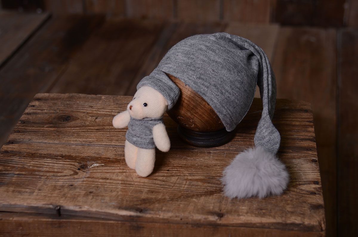 Pack consisting of a hat and a matching teddy bear soft toy. Due to its size, this product is ideal for newborn photo shoots.