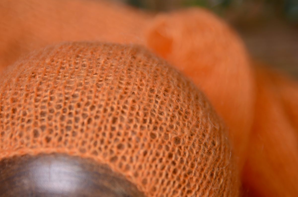 | Orange mohair wrap and hat setIncredible set consisting of a wrap and a hat woven with soft mohair wool threads in the same tone. This product is ideal for all kinds of photo sessions, from those sessions on the bean bag to those in which newborns are placed on stands or inside boxes or bowls. Due to its measures, this set is perfect for newborn sessions.